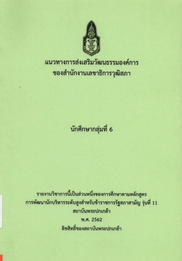 แนวทางการส่งเสริมวัฒนธรรมองค์การของสำนักงานเลขาธิการวุฒิสภา / นักศึกษาสถาบันพระปกเกล้า หลักสูตรการพัฒนานักบริหารระดับสูง สำหรับข้าราชการรัฐสภาสามัญ รุ่นที่ 11 กลุ่มที่ 6 ; สถาบันพระปกเกล้า.
