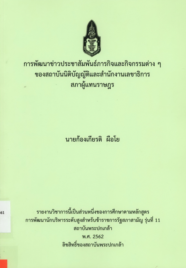การพัฒนาข่าวประชาสัมพันธ์ภารกิจและกิจกรรมต่าง ๆ ของสถาบันนิติบัญญัติและสำนักงานเลขาธิการสภาผู้แทนราษฎร / ก้องเกียรติ ผือโย ; สถาบันพระปกเกล้า.