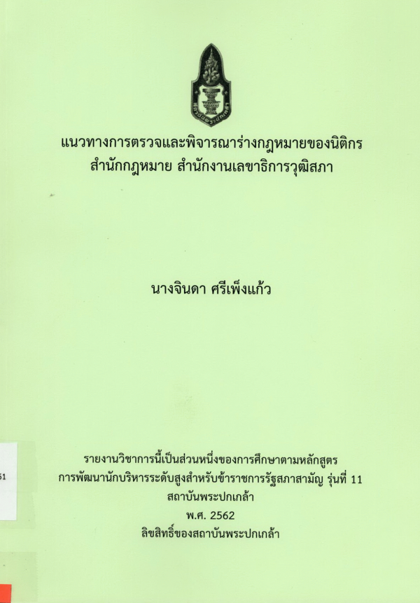 แนวทางการตรวจและพิจารณาร่างกฎหมายของนิติกร สำนักกฎหมาย สำนักงานเลขาธิการวุฒิสภา / จินดา ศรีเพ็งแก้ว ; สถาบันพระปกเกล้า.