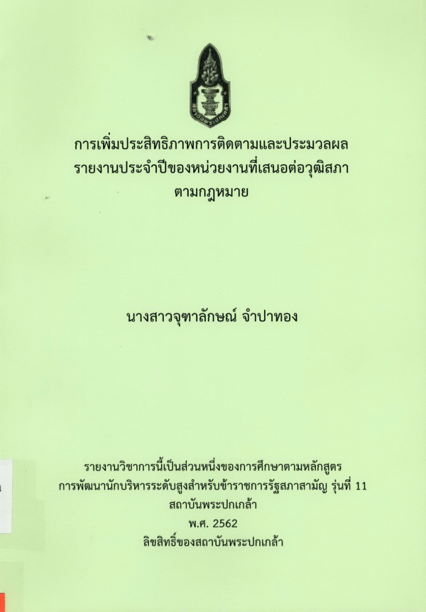 การเพิ่มประสิทธิภาพการติดตามและประมวลผลรายงานประจำปีของหน่วยงานที่เสนอต่อวุฒิสภาตามกฎหมาย / จุฑาลักษณ์ จำปาทอง ; สถาบันพระปกเกล้า.