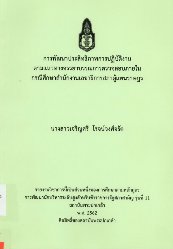 การพัฒนาประสิทธิภาพการปฏิบัติงานตามแนวทางจรรยาบรรณการตรวจสอบภายใน กรณีศึกษาสำนักงานเลขาธิการสภาผู้แทนราษฎร / เจริญศรี โรจน์วงศ์จรัต ; สถาบันพระปกเกล้า.