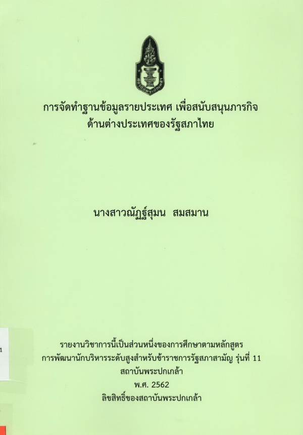 การจัดทำฐานข้อมูลรายประเทศ เพื่อสนับสนุนภารกิจด้านต่างประเทศของรัฐสภาไทย / ณัฏฐ์สุมน สมสมาน ; สถาบันพระปกเกล้า.