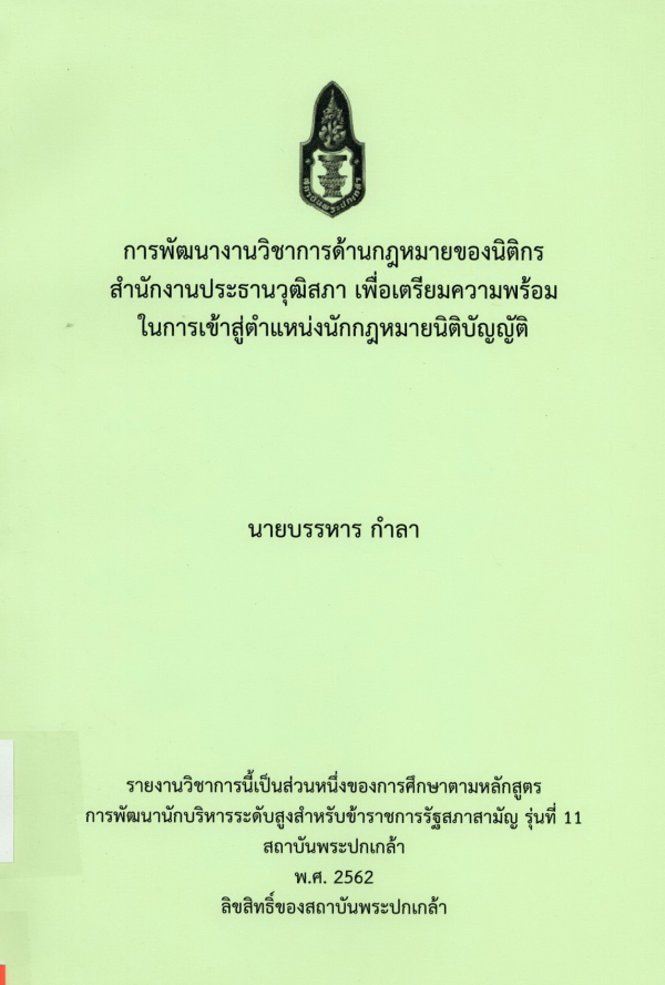 การพัฒนางานวิชาการด้านกฎหมายของนิติกรสำนักงานประธานวุฒิสภา เพื่อเตรียมความพร้อมในการเข้าสู่ตำแหน่งนักกฎหมายนิติบัญญัติ / บรรหาร กำลา ; สถาบันพระปกเกล้า.