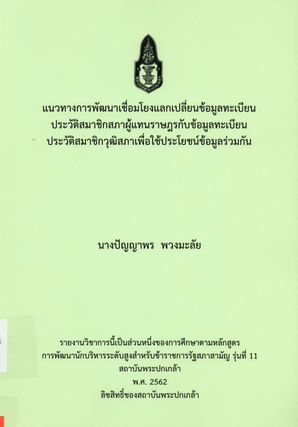 แนวทางการพัฒนาเชื่อมโยงแลกเปลี่ยนข้อมูลทะเบียนประวัติสมาชิกสภาผู้แทนราษฎรกับข้อมูลทะเบียนประวัติสมาชิกวุฒิสภาเพื่อใช้ประโยชน์ข้อมูลร่วมกัน / ปัญญาพร พวงมะลัย ; สถาบันพระปกเกล้า.