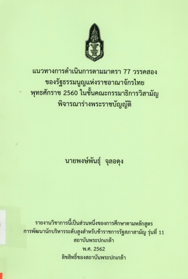 แนวทางการดำเนินการตามมาตรา 77 วรรคสอง ของรัฐธรรมนูญแห่งราชอาณาจักรไทย พุทธศักราช 2560 ในชั้นคณะกรรมาธิการวิสามัญพิจารณาร่างพระราชบัญญัติ / พงษ์พันธ์ุ จุลอดุง ; สถาบันพระปกเกล้า.