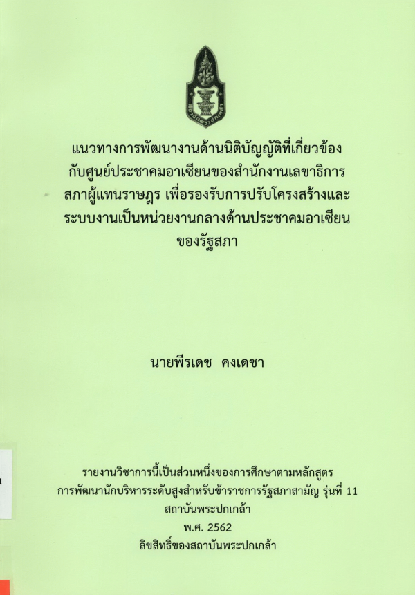 แนวทางการพัฒนางานด้านนิติบัญญัติที่เกี่ยวข้องกับศูนย์ประชาคมอาเซียนของสำนักงานเลขาธิการสภาผู้แทนราษฎร เพื่อรองรับการปรับโครงสร้างและระบบงานเป็นหน่วยงานกลางด้านประชาคมอาเซียนของรัฐสภา / พีรเดช คงเดชา ; สถาบันพระปกเกล้า.