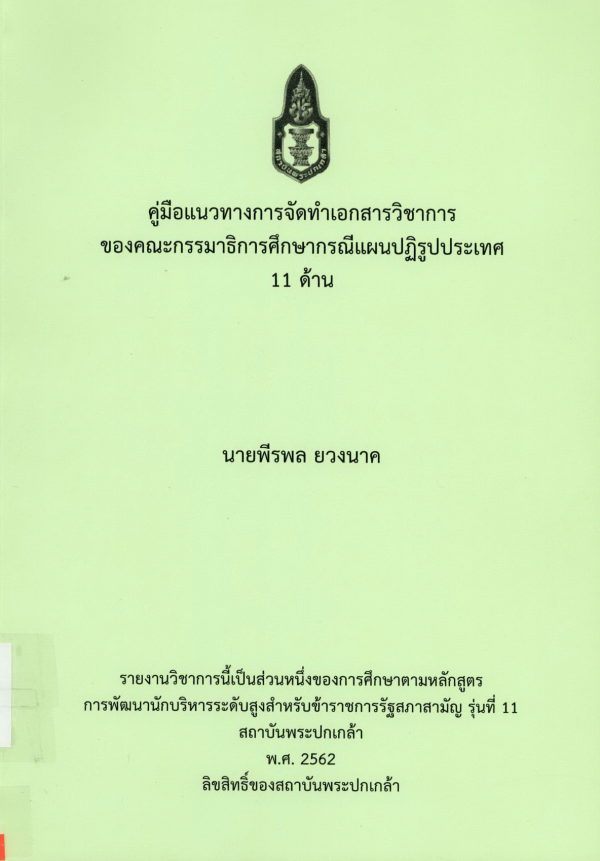 คู่มือแนวทางการจัดทำเอกสารวิชาการของคณะกรรมาธิการศึกษากรณีแผนปฏิรูปประเทศ 11 ด้าน / พีรพล ยวงนาค ; สถาบันพระปกเกล้า.