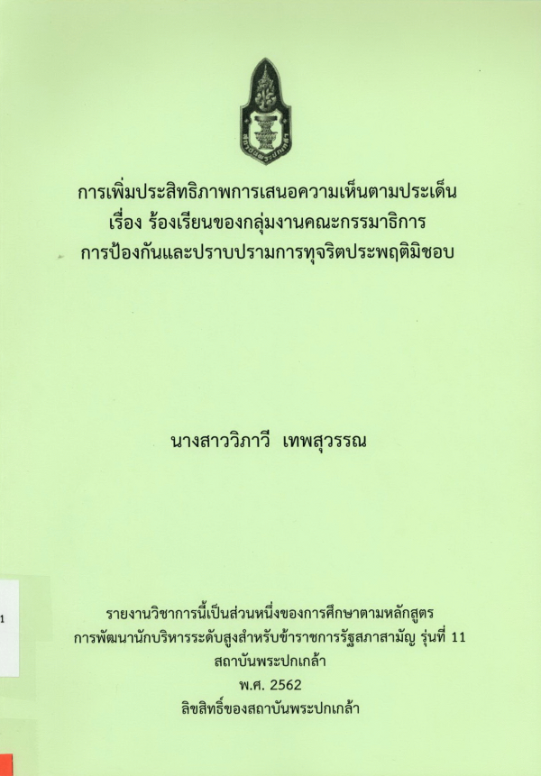 การเพิ่มประสิทธิภาพการเสนอความเห็นตามประเด็น เรื่อง ร้องเรียนของกลุ่มงานคณะกรรมาธิการการป้องกันและปราบปรามการทุจริตประพฤติมิชอบ / วิภาวี เทพสุวรรณ ; สถาบันพระปกเกล้า.
