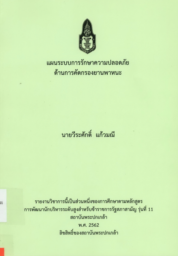 แผนระบบการรักษาความปลอดภัยด้านการคัดกรองยานพาหนะ / วีระศักดิ์ แก้วมณี ; สถาบันพระปกเกล้า.