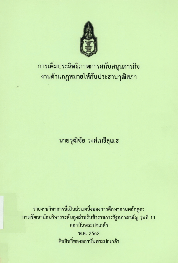 การเพิ่มประสิทธิภาพการสนับสนุนภารกิจงานด้านกฎหมายให้กับประธานวุฒิสภา / วุฒิชัย วงศ์เมธีสุเมธ ; สถาบันพระปกเกล้า.