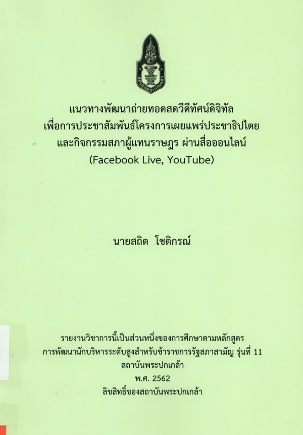 แนวทางพัฒนาถ่ายทอดสดวีดีทัศน์ดิจิทัลเพื่อการประชาสัมพันธ์โครงการเผยแพร่ประชาธิปไตยและกิจกรรมสภาผู้แทนราษฎร ผ่านสื่อออนไลน์ (Facebook Live, You Tube) / สถิต โชติกรณ์ ; สถาบันพระปกเกล้า.