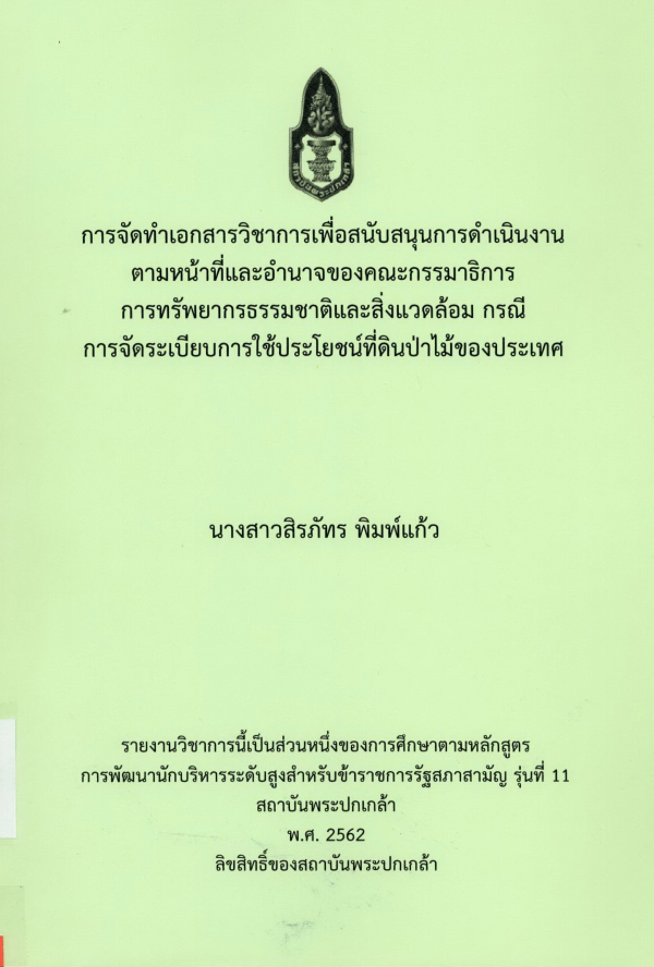 การจัดทำเอกสารวิชาการเพื่อสนับสนุนการดำเนินงานตามหน้าที่และอำนาจของคณะกรรมาธิการการทรัพยากรธรรมชาติและสิ่งแวดล้อม กรณีการจัดระเบียบการใช้ประโยชน์ที่ดินป่าไม้ของประเทศ / สิรภัทร์ พิมพ์แก้ว ; สถาบันพระปกเกล้า.