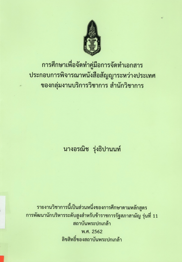 การศึกษาเพื่อจัดทำคู่มือการจัดทำเอกสารประกอบการพิจารณาหนังสือสัญญาระหว่างประเทศของกลุ่มงานบริการวิชาการ สำนักวิชาการ / อรณิช รุ่งธิปานนท์ ; สถาบันพระปกเกล้า.
