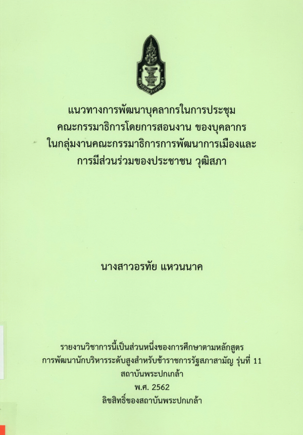 แนวทางการพัฒนาบุคลากรในการประชุมคณะกรรมาธิการโดยการสอนงาน ของบุคลากรในกลุ่มงานคณะกรรมาธิการการพัฒนาการเมืองและการมีส่วนร่วมของประชาชน วุฒิสภา / อรทัย แหวนนาค ; สถาบันพระปกเกล้า.