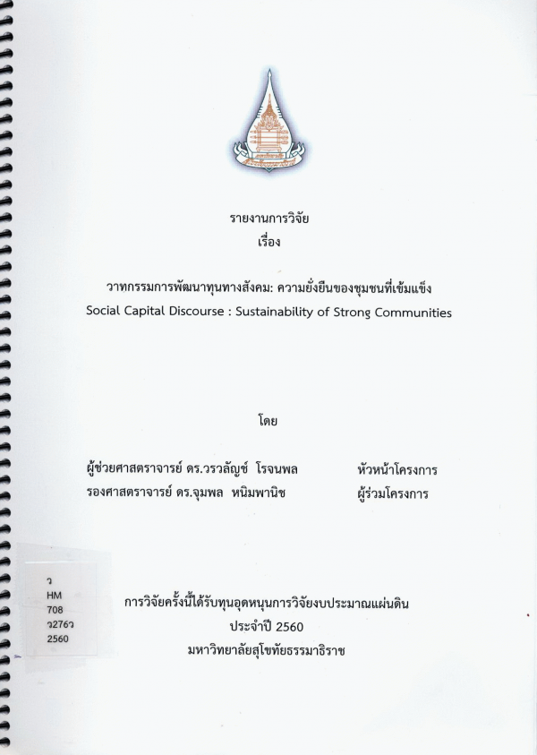 วาทกรรมการพัฒนาทุนทางสังคม : ความยั่งยืนของชุมชนที่เข้มแข็ง = Social capital discourse: sustainability of strong communities / วรวลัญช์ โรจนพล, จุมพล หนิมพานิช.