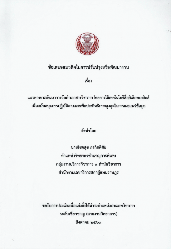 แนวทางการพัฒนาการจัดทำเอกสารวิชาการ โดยการใช้เทคโนโลยีสื่ออิเล็กทรอนิกส์ เพื่อสนับสนุนการปฏิบัติงานและเพิ่มประสิทธิภาพสูงสุดในการเผยแพร่ข้อมูล / โชคสุข กรกิตติชัย.