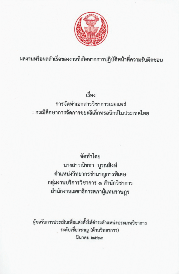 การจัดทำเอกสารวิชาการเผยแพร่ : กรณีศึกษาการจัดการขยะอิเล็กทรอนิกส์ในประเทศไทย / ณิชชา บูรณสิงห์.