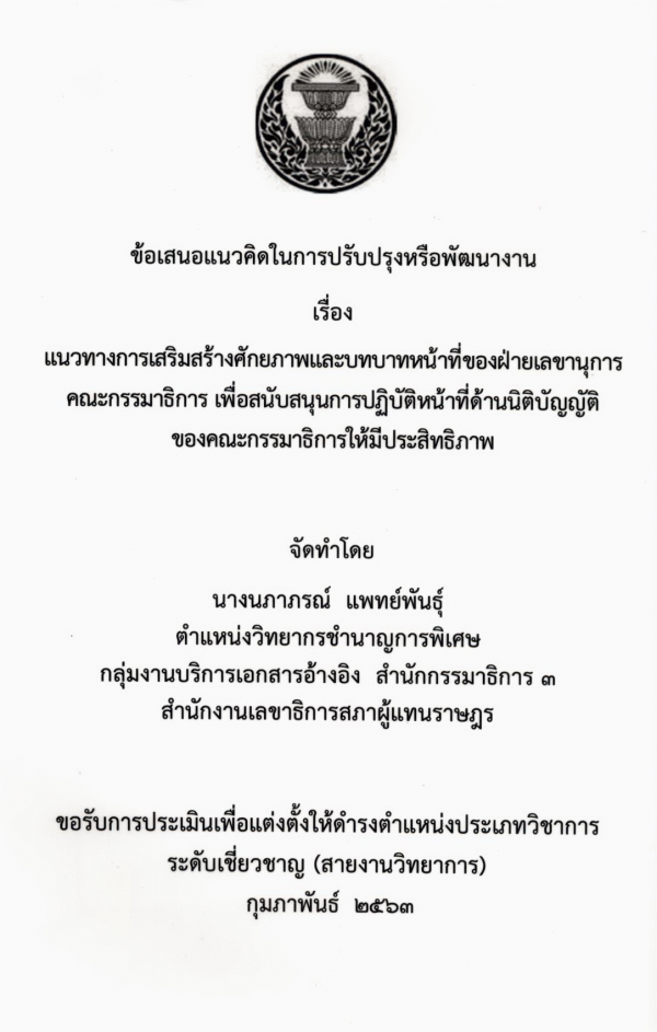 แนวทางการเสริมสร้างศักยภาพและบทบาทหน้าที่ของฝ่ายเลขานุการคณะกรรมาธิการ เพื่อสนับสนุนการปฏิบัติหน้าที่ด้านนิติบัญญัติของคณะกรรมาธิการให้มีประสิทธิภาพ / นภาภรณ์ แพทย์พันธุ์