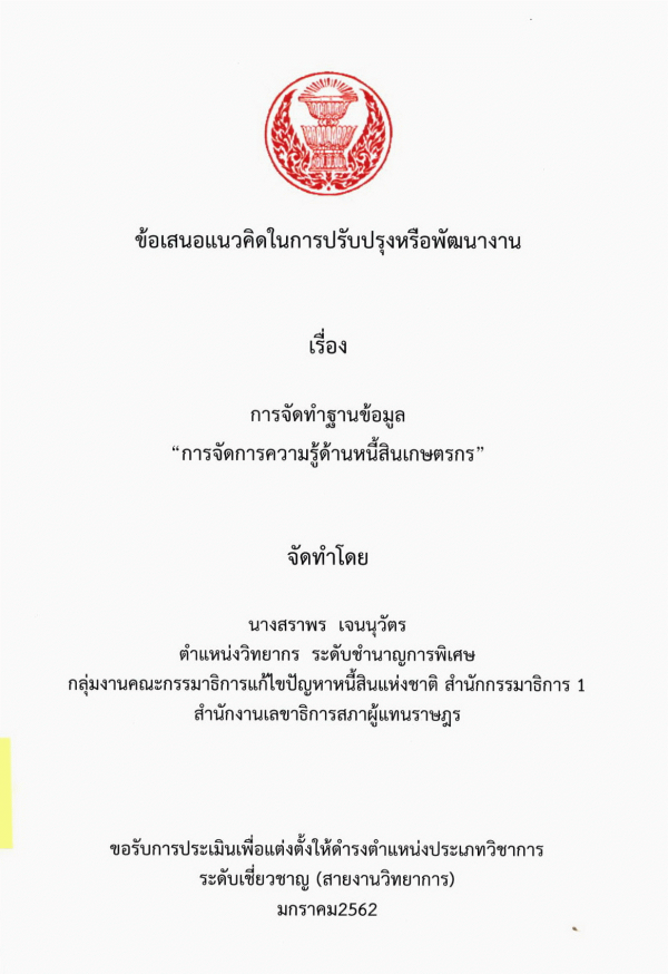 การจัดทำฐานข้อมูล "การจัดการความรู้ด้านหนี้สินเกษตรกร" / สราพร เจนนุวัตร.