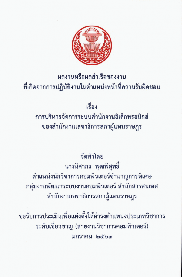 การบริหารจัดการระบบสำนักงานอิเล็กทรอนิกส์ของสำนักงานเลขาธิการสภาผู้แทนราษฎร / นิศากร พุฒพิสุทธิ์.
