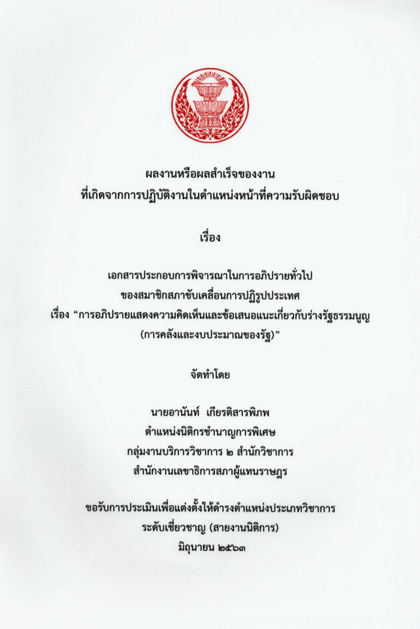 เอกสารประกอบการพิจารณาในการอภิปรายทั่วไปของสมาชิกสภาขับเคลื่อนการปฏิรูปประเทศ เรื่อง "การอภิปรายแสดงความคิดเห็นและข้อเสนอแนะเกี่ยวกับร่างรัฐธรรมนูญ (การคลังและงบประมาณของรัฐ) / อานันท์ เกียรติสารพิภพ.