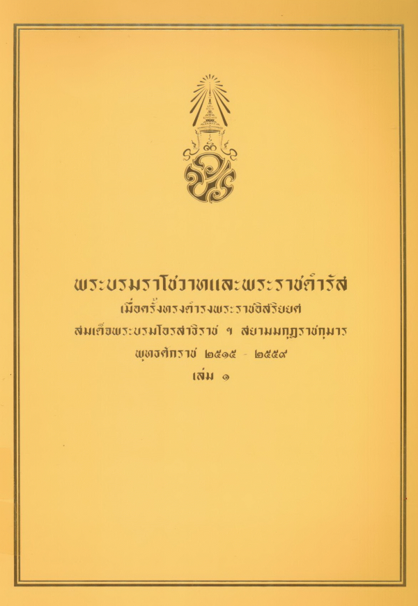 พระบรมราโชวาทและพระราชดำรัส เมื่อครั้งทรงดำรงพระราชอิสริยยศสมเด็จพระบรมโอรสาธิราช ฯ สยามมกุฎราชกุมาร พุทธศักราช 2515 - 2559 เล่ม 1 / สำนักพระราชวัง กรมราชเลขานุการในพระองค์.