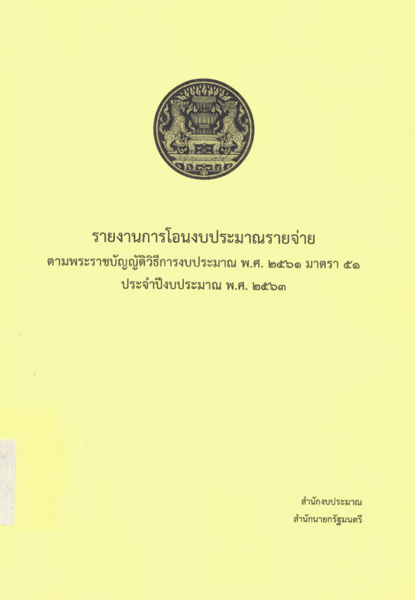 รายงานการโอนงบประมาณรายจ่ายตามพระราชบัญญัติวิธีการงบประมาณ พ.ศ. 2561 มาตรา 51 ประจำปีงบประมาณ พ.ศ. 2563 / สำนักงบประมาณ สำนักนายกรัฐมนตรี.