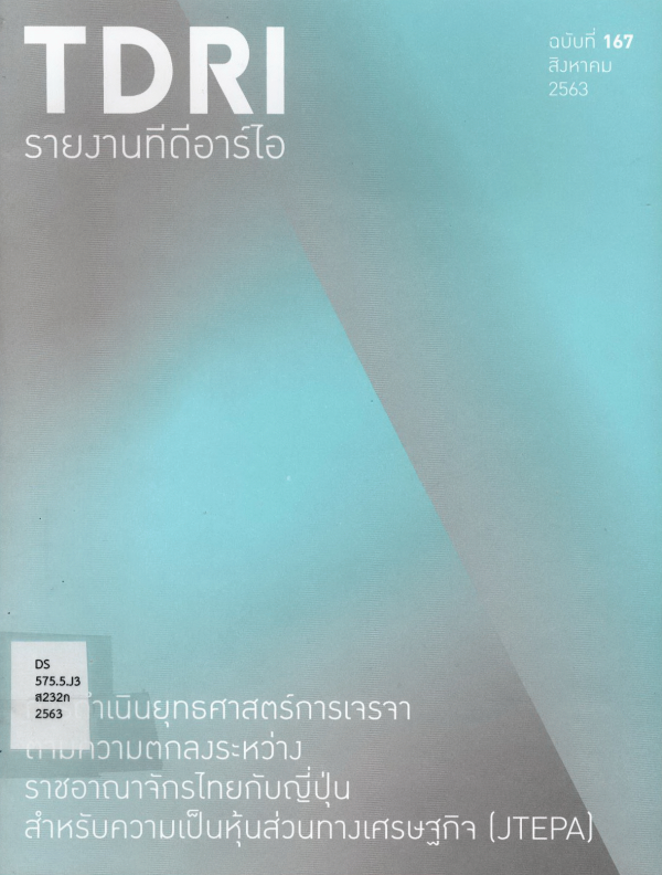 การดำเนินยุทธศาสตร์การเจรจาตามความตกลงระหว่างราชอาณาจักรไทยกับญี่ปุ่นสำหรับความเป็นหุ้นส่วนทางเศรษฐกิจ (JTEPA) / โดย สมเกียรติ ตั้งกิจวาณิช และคณะ ; สถาบันวิจัยเพื่อการพัฒนาประเทศไทย.