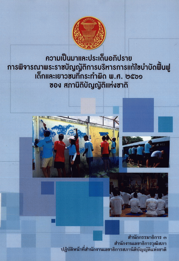ความเป็นมาและประเด็นอภิปรายการพิจารณาพระราชบัญญัติการบริหารการแก้ไขบำบัดฟื้นฟูเด็กและเยาวชนที่กระทำผิด พ.ศ. 2561 ของ สภานิติบัญญัติแห่งชาติ / สำนักกรรมาธิการ 3 สำนักงานเลขาธิการวุฒิสภา ปฏิบัติหน้าที่สำนักงานเลขาธิการสภานิติบัญญัติแห่งชาติ.