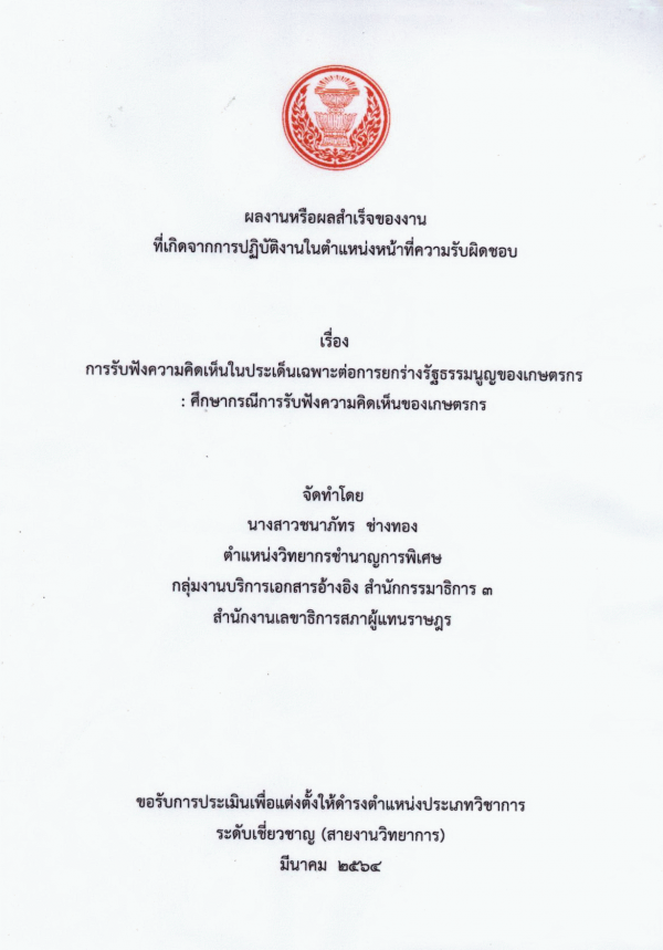 การรับฟังความคิดเห็นในประเด็นเฉพาะต่อการยกร่างรัฐธรรมนูญของเกษตรกร : ศึกษากรณีการรับฟังความคิดเห็นของเกษตรกร / ชนาภัทร ช่างทอง