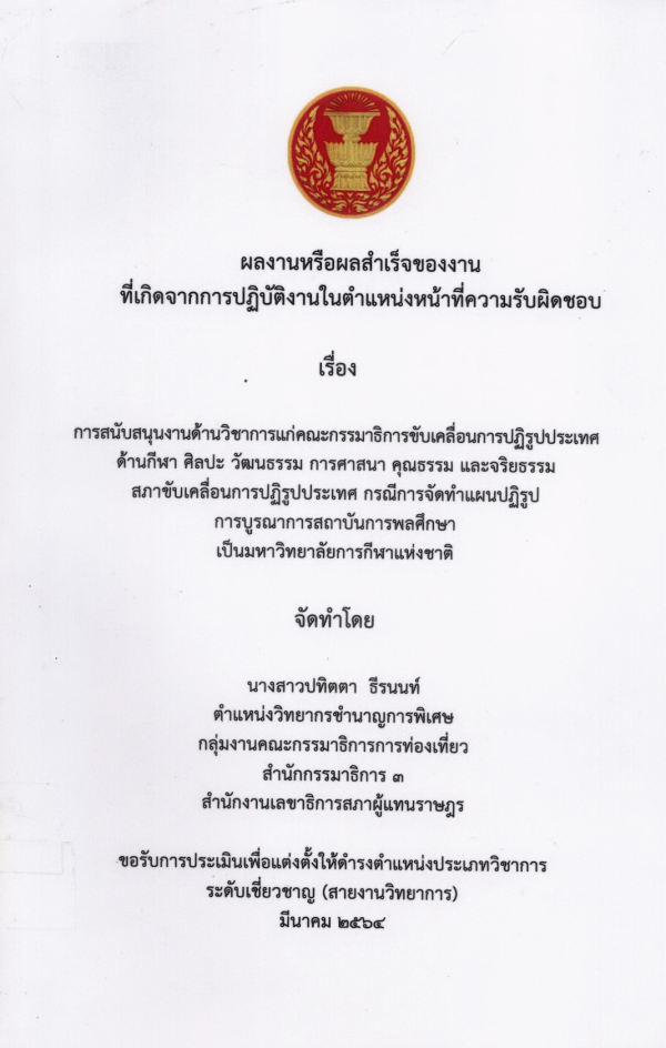 การสนับสนุนงานด้านวิชาการแก่คณะกรรมาธิการขับเคลื่อนการปฏฺิรูปประเทศด้านกีฬา ศิลปะ วัฒนธรรม การศาสนา คุณธรรม และจริยธรรม สภาขับเคลื่อนการปฏิรูปประเทศ กรณีการจัดทำแผนปฏิรูปการบูรณาการสถาบันการพลศึกษาเป็นมหาวิทยาลัยการกีฬาแห่งชาติ / ปทิตตา ธีรนนท์.