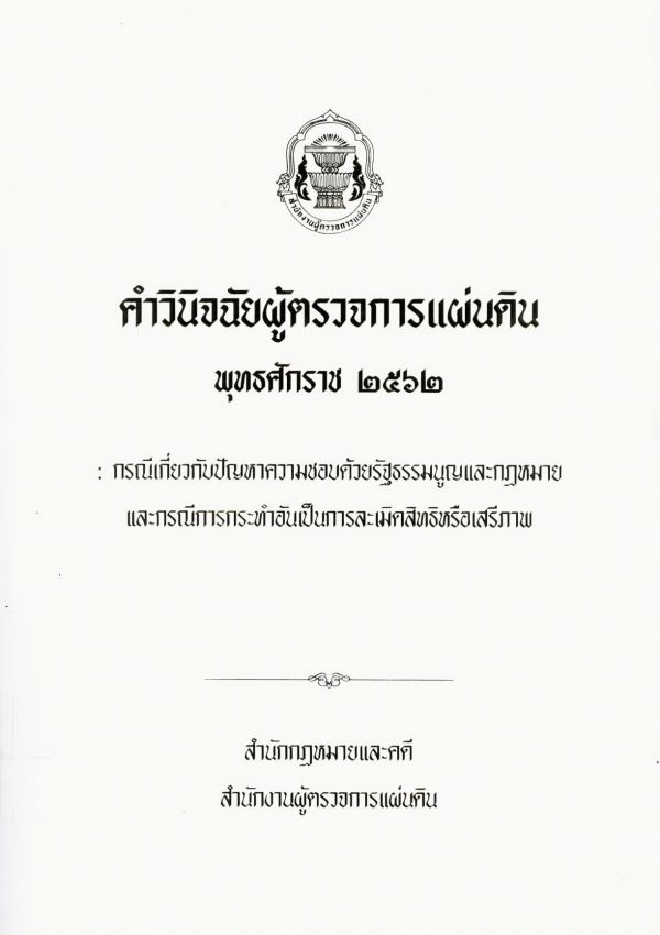 คำวินิจฉัยผู้ตรวจการแผ่นดิน พุทธศักราช 2562 : กรณีเกี่ยวกับปัญหาความชอบด้วยรัฐธรรมนูญและกฎหมาย และกรณีการกระทำอันเป็นการละเมิดสิทธิหรือเสรีภาพ / สำนักกฎหมายและคดี สำนักงานผู้ตรวจการแผ่นดิน.