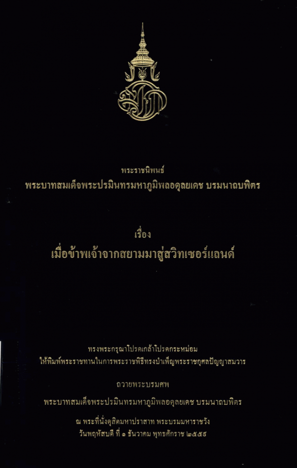 พระราชนิพนธ์พระบาทสมเด็จพระปรมินทรมหาภูมิพลอดุลยเดช บรมนาถบพิตร เรื่อง เมื่อข้าพเจ้าจากสยามมาสู่สวิทเซอร์แลนด์ / สำนักราชเลขาธิการ.