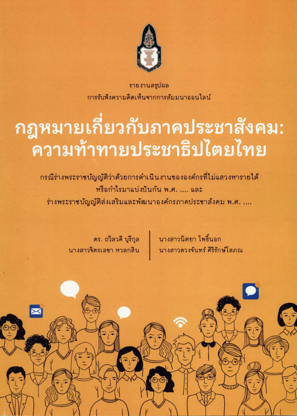 รายงานสรุปผลการรับฟังความคิดเห็นจากการสัมมนาออนไลน์ กฎหมายเกี่ยวกับภาคประชาสังคม : ความท้าทายประชาธิปไตยไทย กรณีร่างพระราชบัญญัติว่าด้วยการดำเนินงานขององค์กรที่ไม่แสวงหารายได้หรือกำไรมาแบ่งปันกัน พ.ศ. .... และร่างพระราชบัญญัติส่งเสริมและพัฒนาองค์กรภาคประชาสังคม พ.ศ. .... / ถวิลวดี บุรีกุล...[และคนอื่น ๆ].