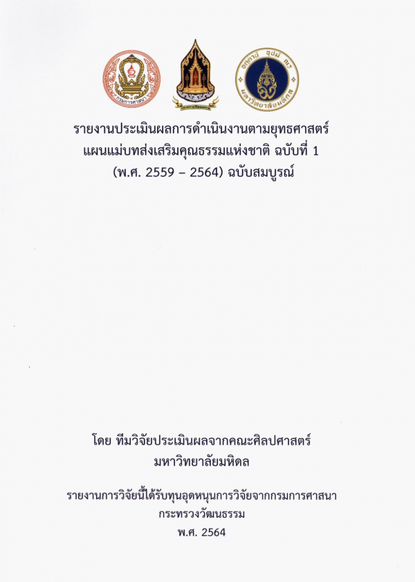 รายงานประเมินผลการดำเนินงานตามยุทธศาสตร์ แผนแม่บทส่งเสริมคุณธรรมแห่งชาติ ฉบับที่ 1 (พ.ศ. 2559 - 2564) ฉบับสมบูรณ์ / ทีมวิจัยประเมินผลจากคณะศิลปศาสตร์. มหาวิทยาลัยมหิดล.