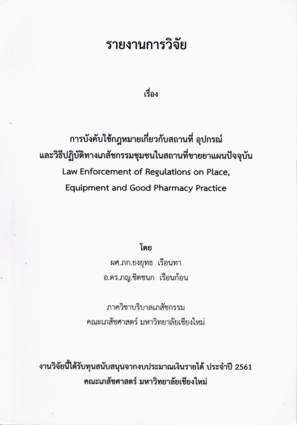 การบังคับใช้กฎหมายเกี่ยวกับสถานที่ อุปกรณ์ และวิธีปฏิบัติทางเภสัชกรรมชุมชนในสถานที่ขายยาแผนปัจจุบัน = Law enforcement of regulations on place, equipment and good pharmacy practice / ยงยุทธ เรือนทา และชิดชนก เรือนก้อน.