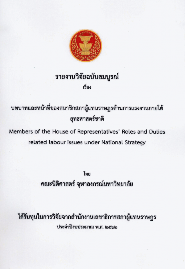 บทบาทและหน้าที่ของสมาชิกสภาผู้แทนราษฎรด้านการแรงงานภายใต้ยุทธศาสตร์ชาติ = Members of the house of representatives' roles and duties related labour issues under national strategy. ศุภศิษฏ์ ทวีแจ่มทรัพย์, วิมพัทธ์ ราชประดิษฐ์ และฉัฏฐเมษ ภิรมย์พานิช.