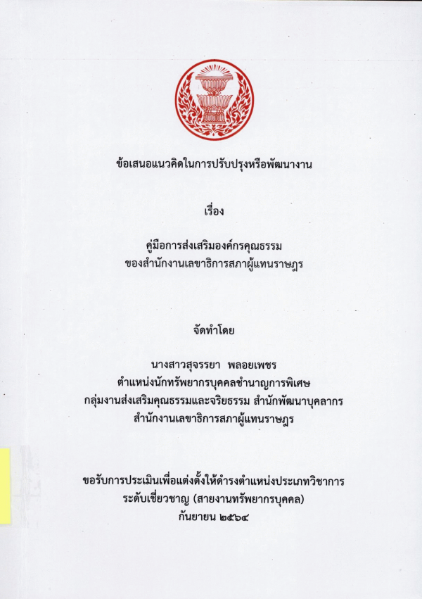 คู่มือการส่งเสริมองค์กรคุณธรรมของสำนักงานเลขาธิการสภาผู้แทนราษฎร / สุจรรยา พลอยเพชร.