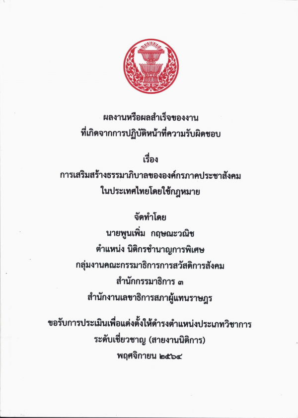การเสริมสร้างธรรมาภิบาลขององค์กรภาคประชาสังคมในประเทศไทยโดยใช้กฎหมาย / พูนเพิ่ม กฤษณะวณิช.