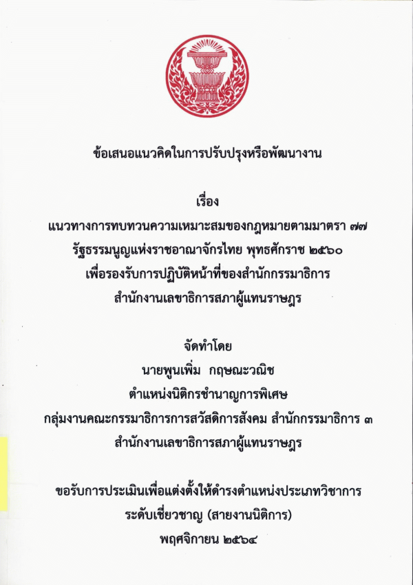แนวทางการทบทวนความเหมาะสมของกฎหมายตามมาตรา 77 รัฐธรรมนูญแห่งราชอาณาจักรไทย พุทธศักราช 2560 เพื่อรองรับการปฏิบัติหน้าที่ของสำนักกรรมาธิการ สำนักงานเลขาธิการสภาผู้แทนราษฎร / พูนเพิ่ม กฤษณะวณิช.