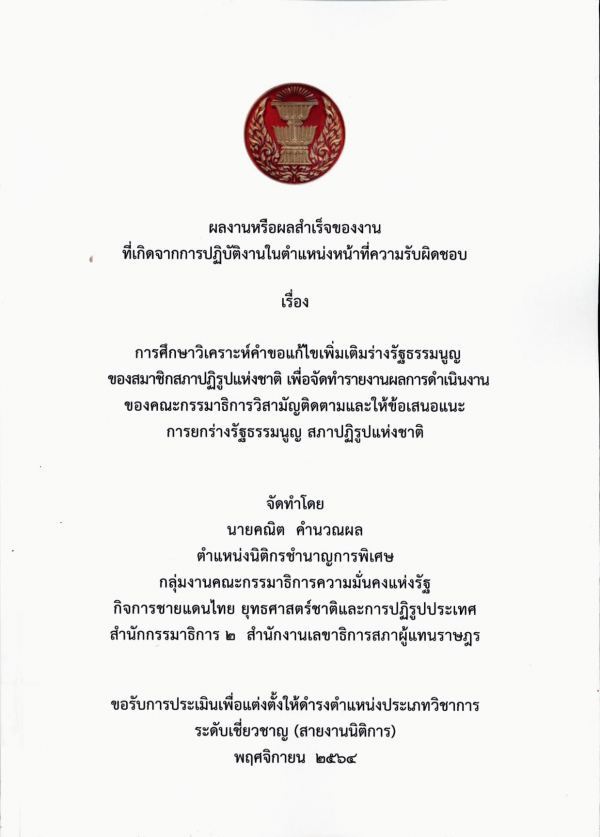 การศึกษาวิเคราะห์คำขอแก้ไขเพิ่มเติมร่างรัฐธรรมนูญของสมาชิกสภาปฏิรูปแห่งชาติ เพื่อจัดทำรายงานผลการดำเนินงานของคณะกรรมาธิการวิสามัญติดตามและให้ข้อเสนอแนะการยกร่างรัฐธรรมนูญ สภาปฏิรูปแห่งชาติ / คณิต คำนวณผล.