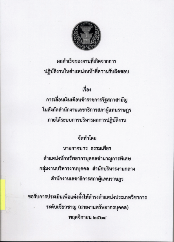 การเลื่อนเงินเดือนข้าราชการรัฐสภาสามัญในสังกัดสำนักงานเลขาธิการสภาผู้แทนราษฎรภายใต้ระบบการบริหารผลการปฏิบัติงาน / กาจบวร ธรรมเพียร.