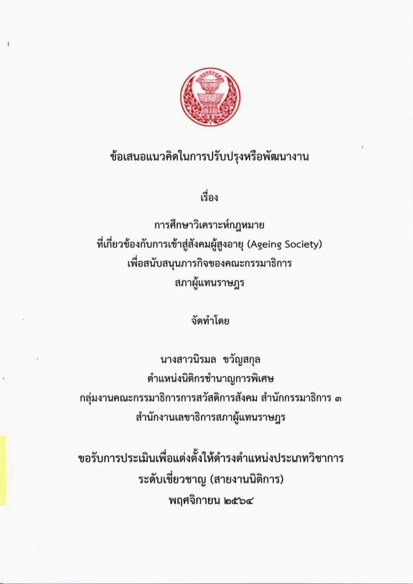 การศึกษาวิเคราะห์กฎหมายที่เกี่ยวข้องกับการเข้าสู่สังคมผู้สูงอายุ (Ageing Society) เพื่อสนับสนุนภารกิจของคณะกรรมาธิการ สภาผู้แทนราษฎร / นิรมล ขวัญสกุล.