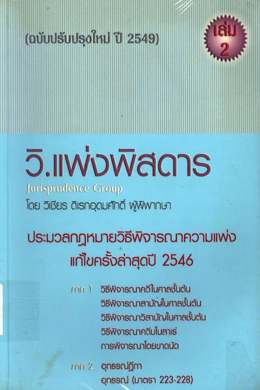 Other title: - วิ.แพ่งพิสดาร เล่ม 2 ฉบับปรับปรุงใหม่ปี 2549 ประมวลกฎหมายวิธีพิจารณาความแพ่ง (แก้ไขครั้งล่าสุดปี 2546) ภาค 2 วิธีพิจารณาคดีในศาลชั้นต้น วิธีพิจารณาในศาลชั้นต้น วิธีพิจารณาวิสามัญในศาลชั้นต้น วิธีพิจารณาคดีมโนสาเร่ การพิจารณาโดยขาดนัด ภาค 3 อุทธรณ์ฎีกา อุทธรณ์ (มาตรา 223-228).