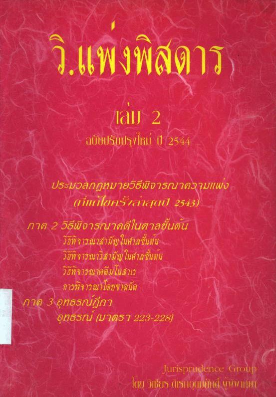 Other title: - วิ. แพ่งพิสดาร เล่ม 2 ฉบับปรับปรุงใหม่ ปี 2544 ประมวลกฎหมายวิธีพิจารณาความแพ่ง (ที่แก้ไขครั้งล่าสุด ปี 2543) ภาค 2 วิธีพิจารณาคดีในศาลชั้นต้น วิธีพิจารณาสามัญในศาลชั้นต้น วิธีพิจาณาวิสามัญในศาลชั้นต้น วิธีพิจารณาคดีมโนสาเร่ การพิจารณาโดยขาดนัด ภาค 3 อุทธรณ์ฎีกา อุทธรณ์ (มาตรา 223-228).